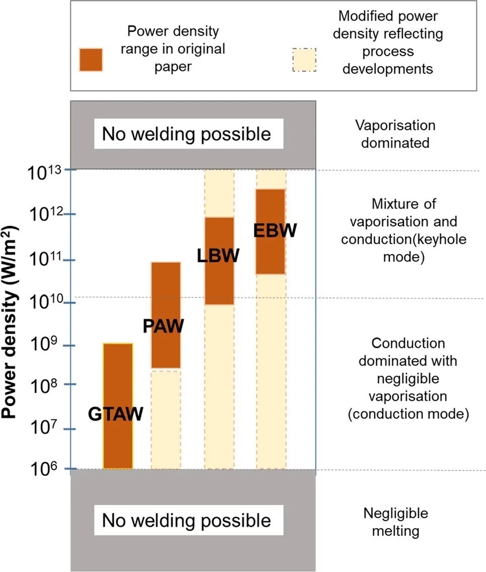 图3 不同焊接工艺的功率密度,“GTAW”为TIG焊接,“PAW”为等离子弧焊